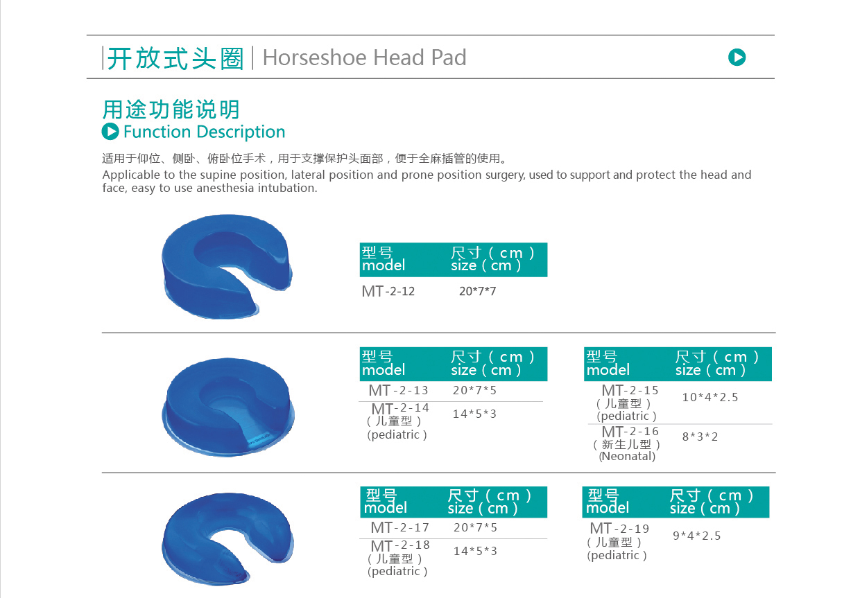 【產品用途】:適用于仰位、側臥、俯臥位手術,用于支撐保護頭面部,便于全麻插管的使用。