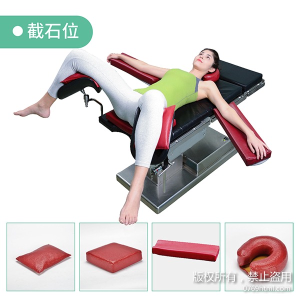 截石位姿勢是患者仰臥,臀部齊手術(shù)床緣,兩腿屈髖、雙膝置于腿架上,兩腿間角度約為60-90°。適用于直腸、肛門、會陰等部位手術(shù),接觸病床的頭部、肘部、臀部、腘窩部預(yù)防褥瘡需要使用手術(shù)體位墊,此方案包含高碗頭圈、上肢凹形體位墊、臀墊和記憶棉方墊。