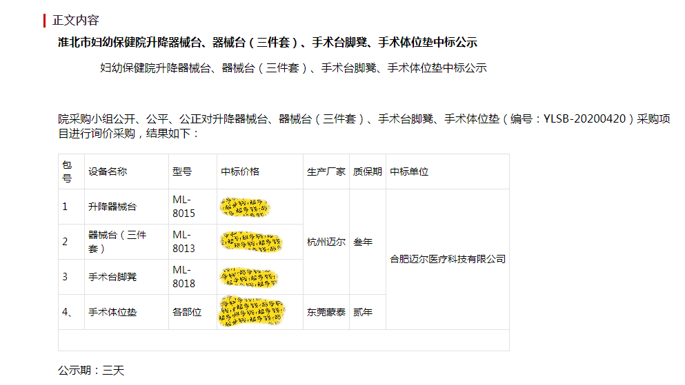 淮北市婦幼保健院手術(shù)體位墊中標(biāo)后進院清單